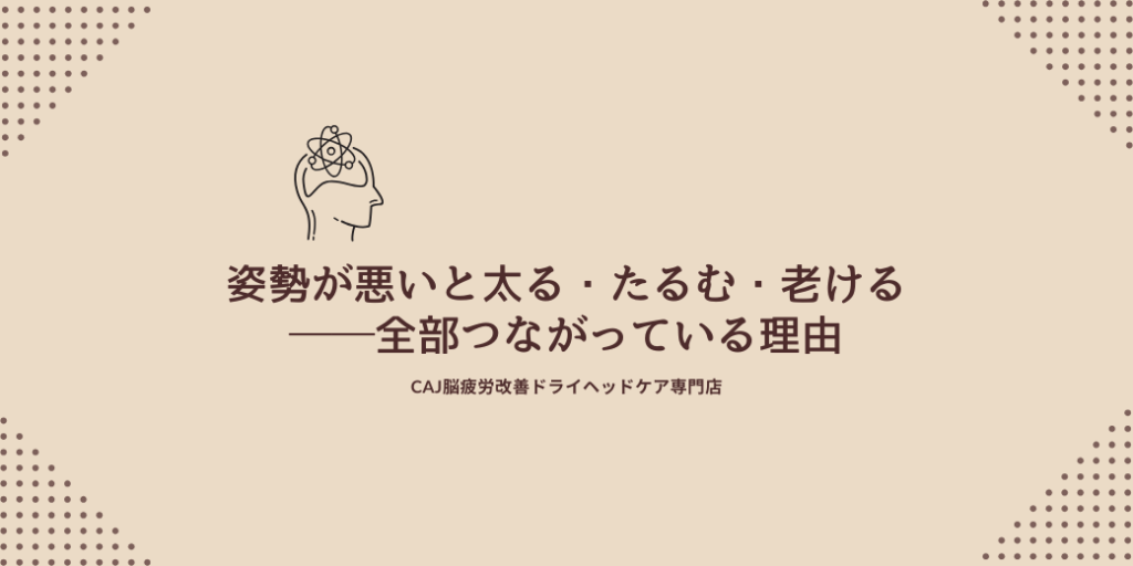 ―見た目の悩みの9割は「姿勢」で説明できます 鏡を見たときに、 「なんだか太って見える」「最近、急に老けた気がする…」「体がたるんでメリハリがなくなってきた」 そんな変化を感じていませんか? 実はこの「見た目の変化」、体重や年齢よりも “姿勢の崩れ”が原因 になっていることがとても多いんです。 ■ 姿勢が崩れると何が起こるの? 姿勢はただの“見た目の形”ではなく、体のあらゆる機能の土台です。 ここが崩れると、次のような連鎖が起こります。 ① 姿勢の崩れ → 呼吸が浅くなる → 脂肪が落ちにくい体に 猫背や巻き肩になると胸がつぶれ、呼吸が浅くなることは有名です。 呼吸が浅くなると… ・酸素が十分に取り込めない・エネルギーがうまく燃えない・脂肪燃焼が低下 つまり、代謝が落ちて太りやすくなるという流れ。 呼吸の浅さは“見えない代謝ダウン”。気づかれにくいけど、痩せない大きな原因です。 ② 頭・首・肩が凝る → 顔がたるむ・老け見えが加速 姿勢が崩れると、首肩のこりが慢性化します。 すると… ・血流が悪くなる・むくみが顔に残る・フェイスラインがぼやける・ほうれい線が深く見える・眼輪筋が弱り、まぶたが重く見える つまり “見た目年齢が上がる” という現象に直結。 美容クリニックに行く前に、まず姿勢を整えるだけで老け見えが一気に軽くなることも珍しくありません。 ③ 姿勢の崩れ → インナーマッスルが働かない → 下半身が太く見える 股関節まわりの筋肉が弱くなると… ・前ももが張る・お尻が垂れる・下半身が大きく見える・ぽっこりお腹が出てくる 姿勢が悪いと“本来働くべき筋肉”が使われず、余計な場所ばかり発達します。 その結果、太って見えるシルエットに。 ④ 姿勢の崩れは「脳の疲れ」からも起きる 意外かもしれませんが… 姿勢をコントロールしているのは “筋肉ではなく脳” です。 脳が疲れてくると、 ・身体の位置を把握するセンサーが鈍る・無意識の姿勢調整ができなくなる・力が入りやすい位置しか選べなくなる そのため、姿勢がどんどん崩れていきます。 これはちょうど、スマホのGPSが狂うとナビが正しく案内できなくなるのと同じ。 脳のセンサーが曇ると、姿勢も崩れるのです。 ■ 姿勢を整えるために必要なのは「脳の回復」と「筋肉のバランス」 姿勢を戻すために大切なのは—— ✔ 脳の